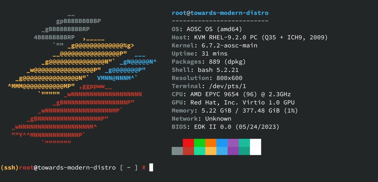 近日,北京大学学生 Linux 俱乐部 (LCPU) 为社区提供了一台 x86 服务器,助力我社 AOSC OS x86 (amd64, i486) 移植的维护工作;该服务器为虚拟机,分配 96 个核心和 384GiB 内存,是我社目前相对性能最高的构建服务器。