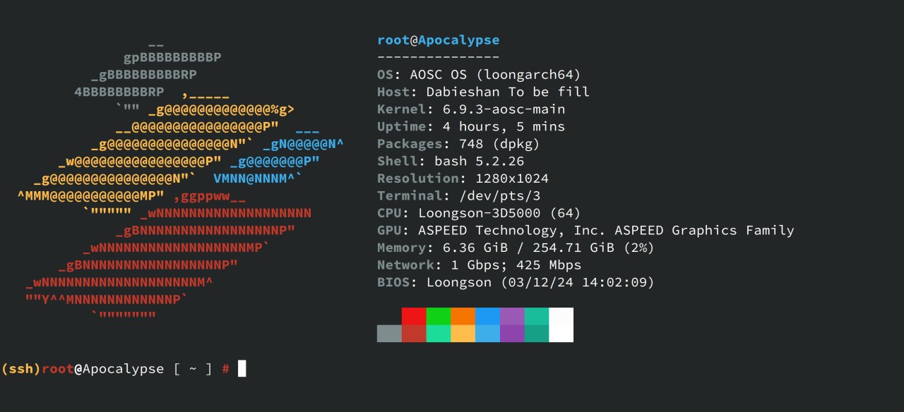 龙架构新构建服务器上线2024-06-09近日,社区一名好友捐赠了一台双路龙芯 3D5000 服务器(搭载 64 个核心及 256GiB 内存),助力我社安同 OS 龙架构版本的移植维护工作;该机器命名为 "Apocalypse",是我社性能最高的龙架构构建服务器。