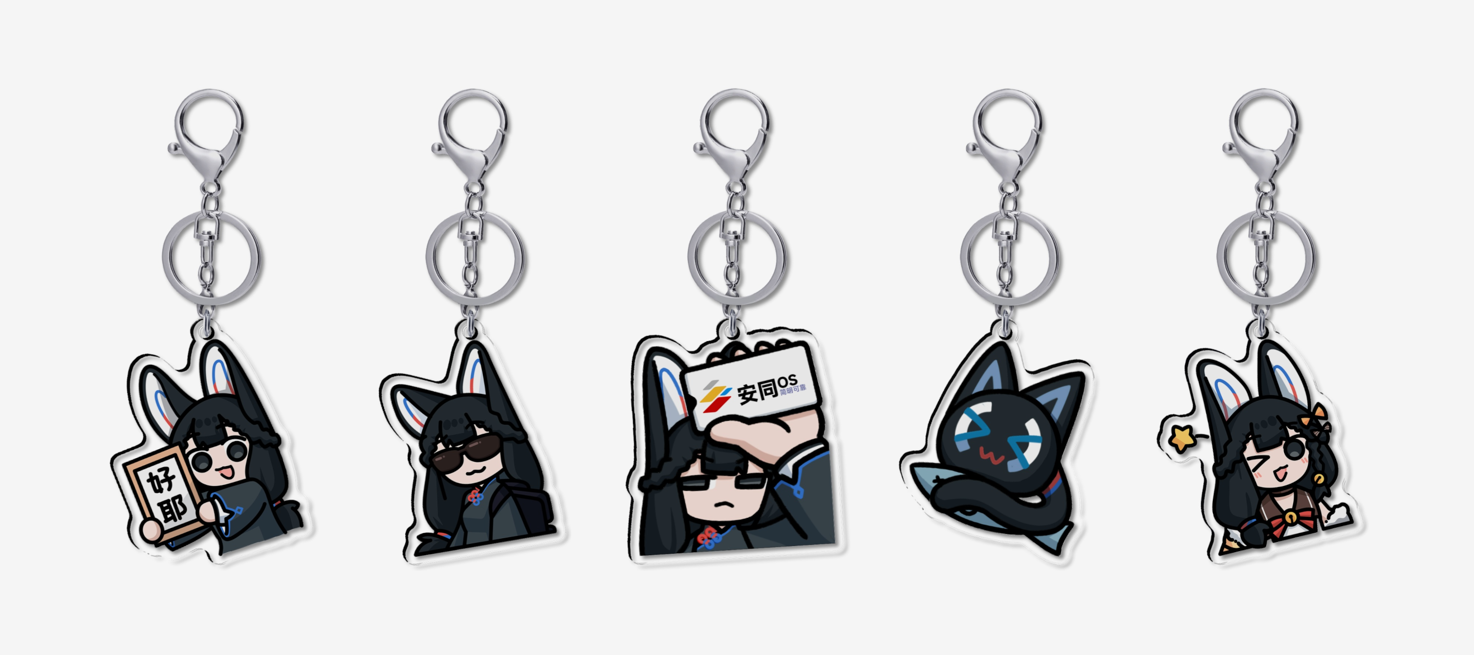 我们为今年的线下活动设计了钥匙扣周边,基于五十根炸虾老师的安安同同贴图包制作;届时与会者们可随机领取一个钥匙扣,无法现场参加的朋友们可在 AOSCC 2024 结束后支付邮费领取。
