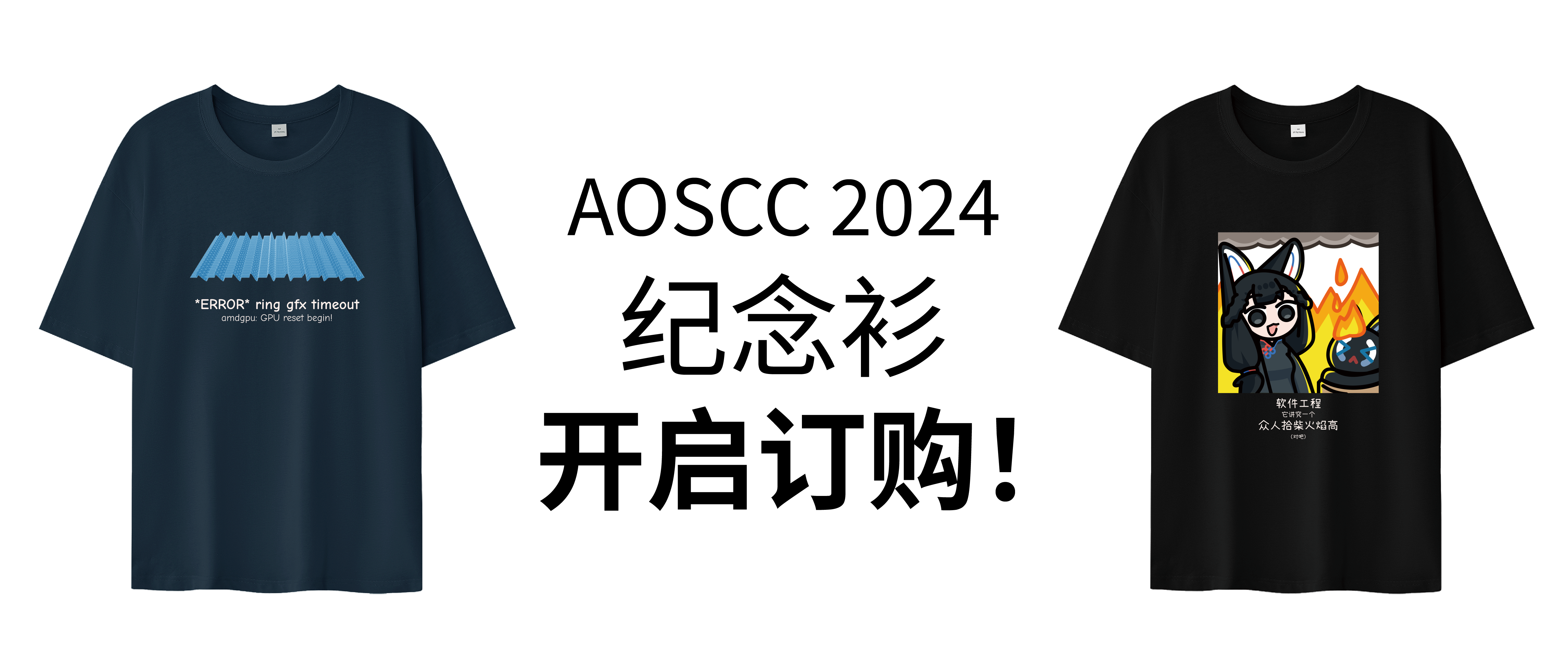 我们为本次 AOSCC 设计了两款纪念衫(T 恤),由于需要按批次订购且单价较高(约 60 ~ 70 元一件),有意购买者请于 UTC+8 时间 7 月 5 日午间 12 时前填写本表;如需海外收货,请通过如下联系方式咨询详情: