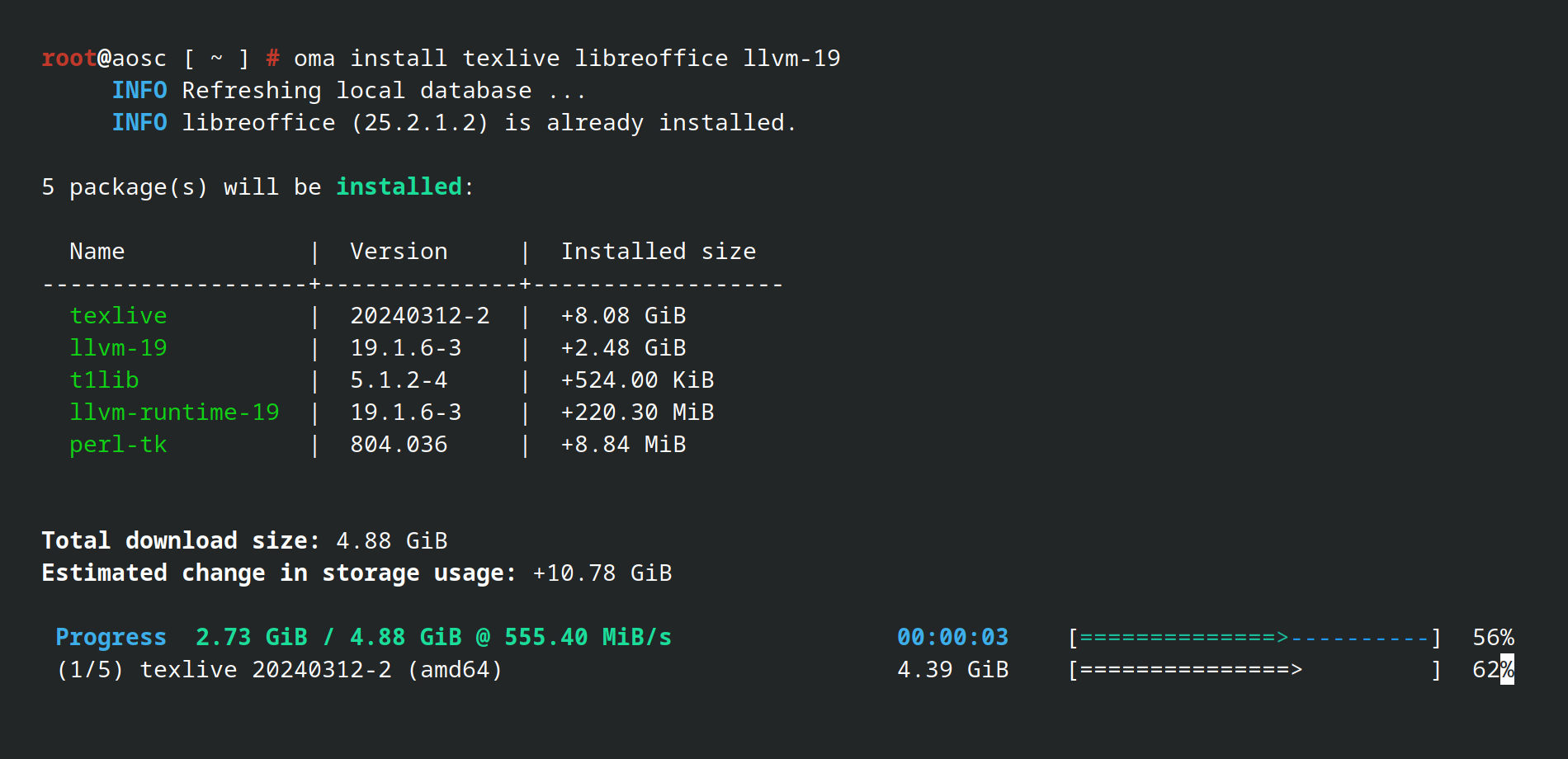 经过多版维护、充实对 APT 缓存机制的理解后,这一问题终于在 oma 1.15 得到了解决:从该版开始,oma 不再复制本地源中的软件包,而是直接在缓存路径中创建符号链接。这样一来,oma 也可以和 APT 一样瞬间完成从本地源中“下载”和缓存软件包的操作了。