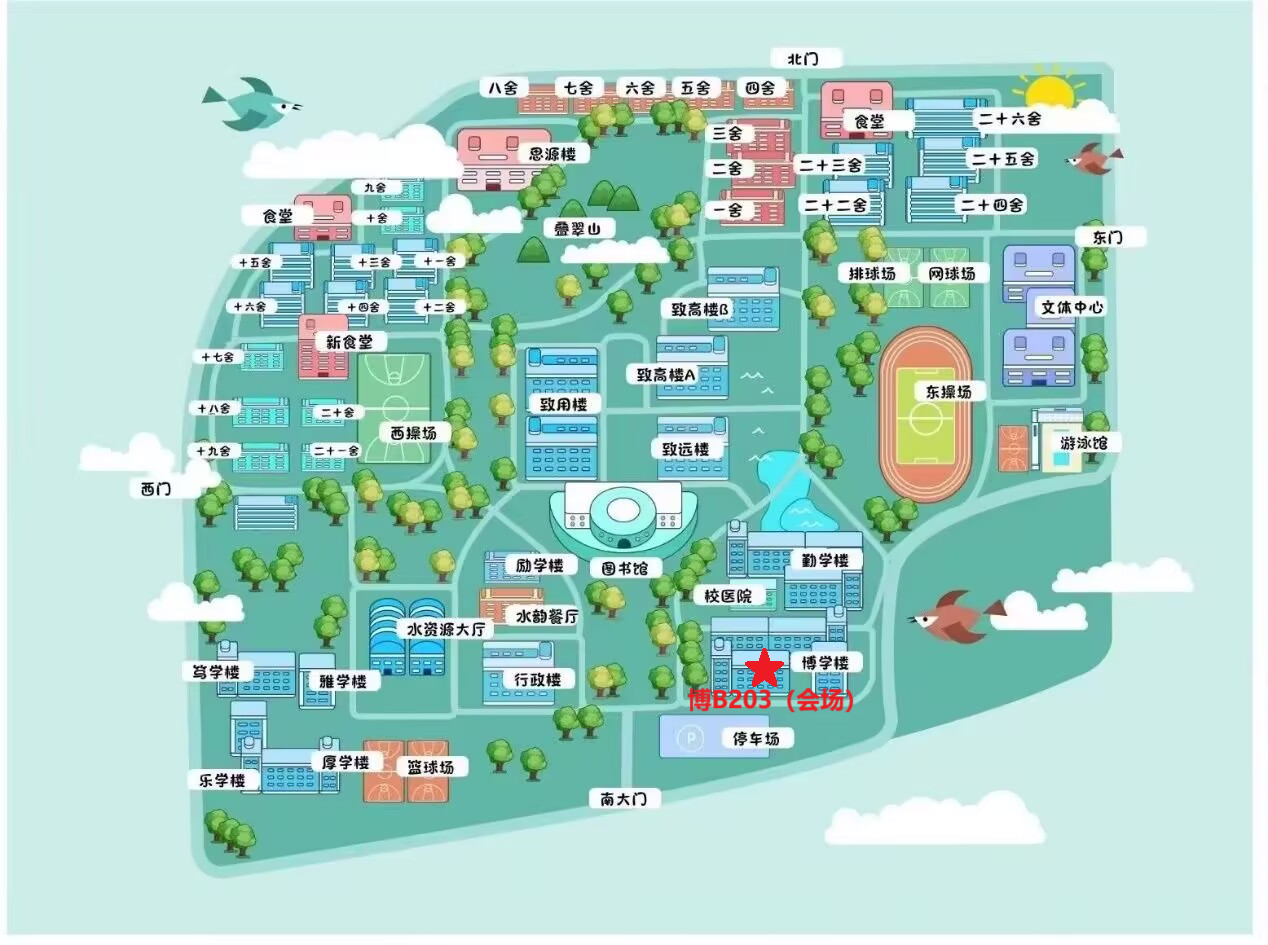 会场位于河海大学江宁校区博学楼西侧 B203 教室,建议从校区东门或南门进入,西门与北门无法通行,详情如图: