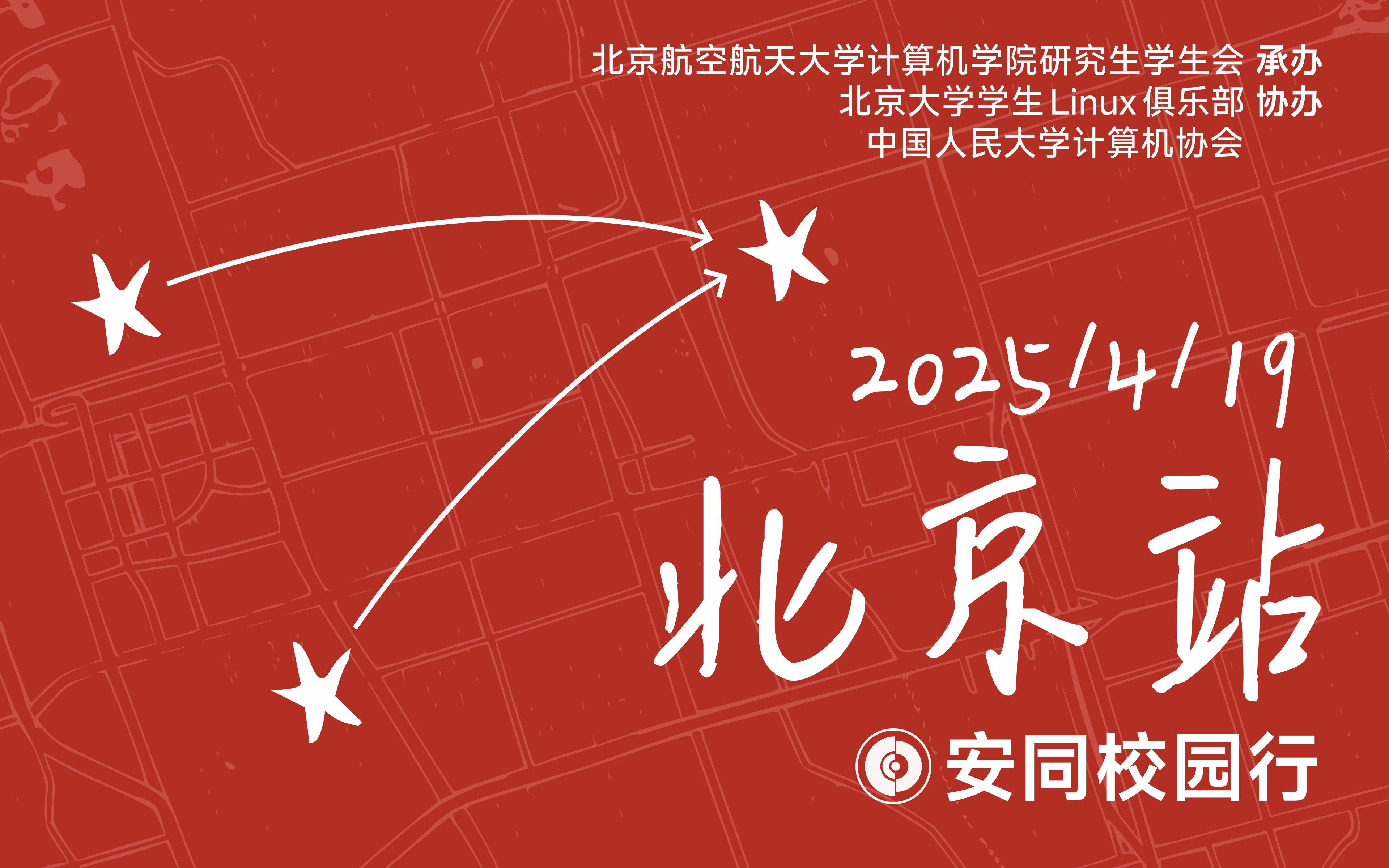 安同校园行・北京站2025-04-152025 年 4 月 19 日,北京航空航天大学(学院路校区)见!本次活动由北京航空航天大学计算机学院研究生学生会承办,并由北京大学学生 Linux 俱乐部、中国人民大学计算机协会协办,感谢三所高校社团同学们的支持!本次活动面向社会公众开放,我们将尽快发布相关指南信息,请留意社区各公众平台的后续更新。
