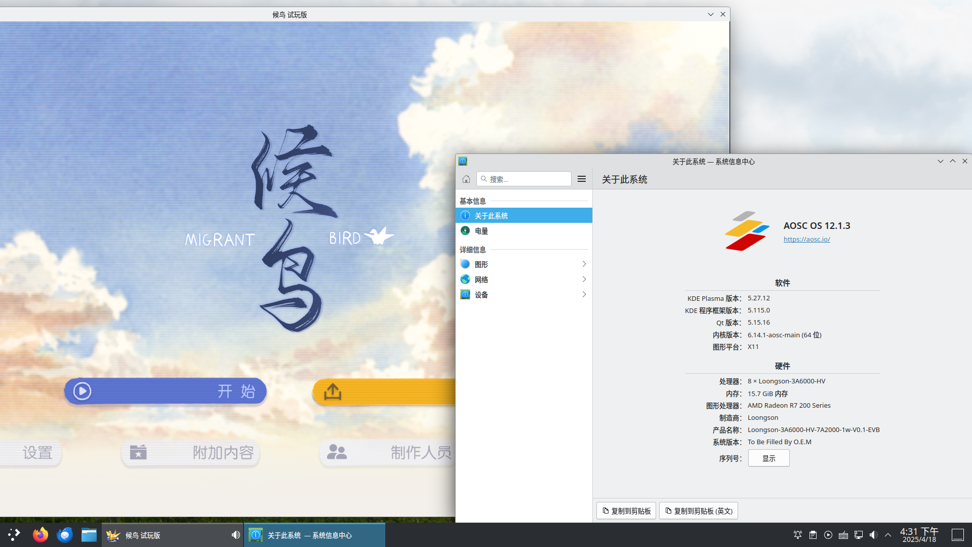《候鸟》基于 Ren'Py 开源视觉小说引擎开发,本次 KIDFansClub 授权安同 OS 分发该游戏试玩版,旨在演示该引擎对不同处理器架构平台(尤其是如龙芯等国产处理器平台)的支持;安同 OS 任意架构版本的用户均可安装运行《候鸟》试玩版。