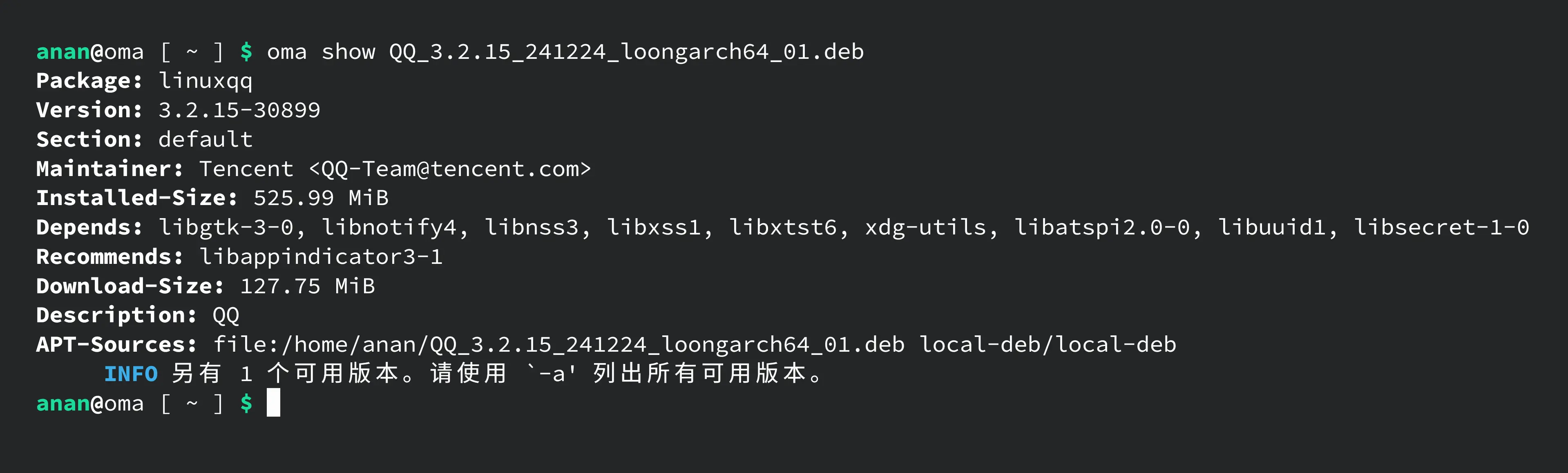 如同先前 show(查看基础信息), depends(查看依赖)及 rdepends(查看逆向依赖)命令一般,除了可以如 oma show bash 一样显示 bash 软件包的基础信息外,现在还支持如上图一样在安装前查阅如腾讯 QQ 这样的第三方软件包的基础信息、依赖和逆向依赖,实现“指哪打哪”的功能一致性。