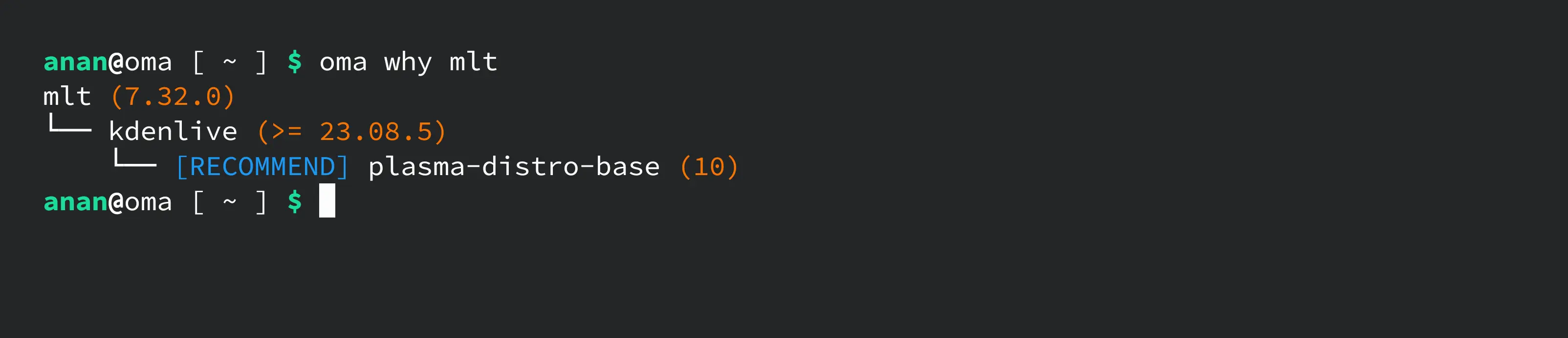 oma tree [软件包]- 查阅某个软件包的依赖树oma why [软件包]- 查阅某个软件包的反向依赖(即“为什么这个软件包安装在了我的电脑上?”)