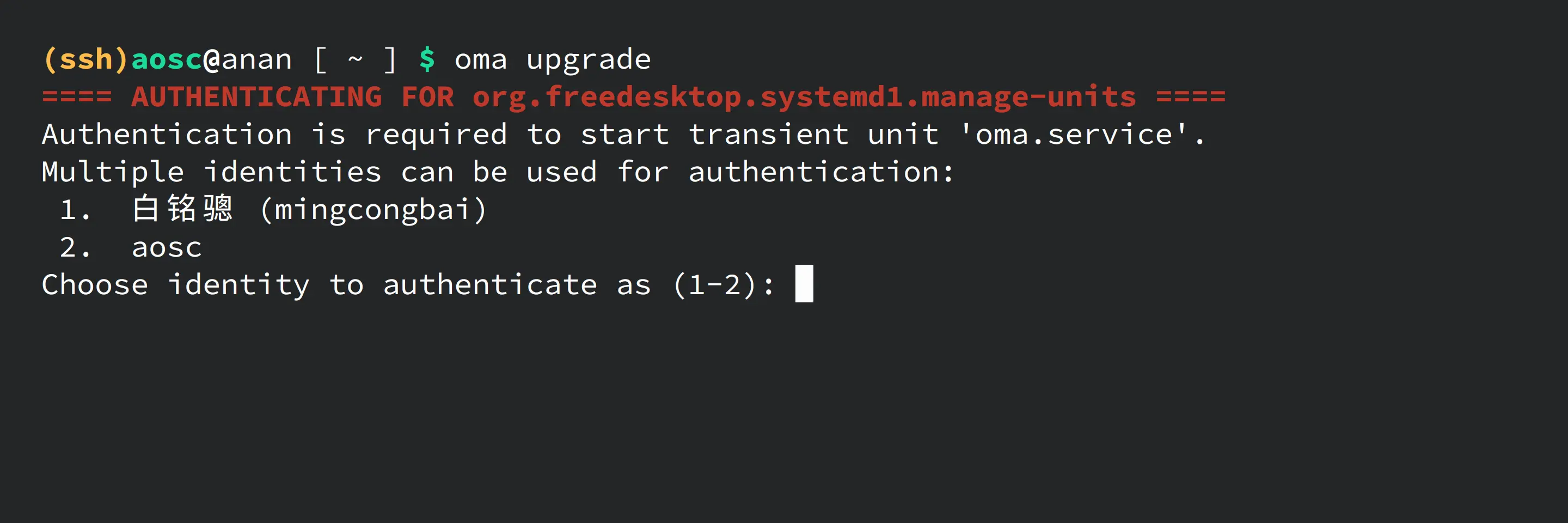 systemd-run替代pkexec作为默认鉴权工具,可允许用户在桌面、SSH 和 TTY 下均能使用同样的方式提权,亦能确保 oma 在被意外中止(如意外关闭 oma 所在的终端串口)时正确退出 - 可以为 oma 引入