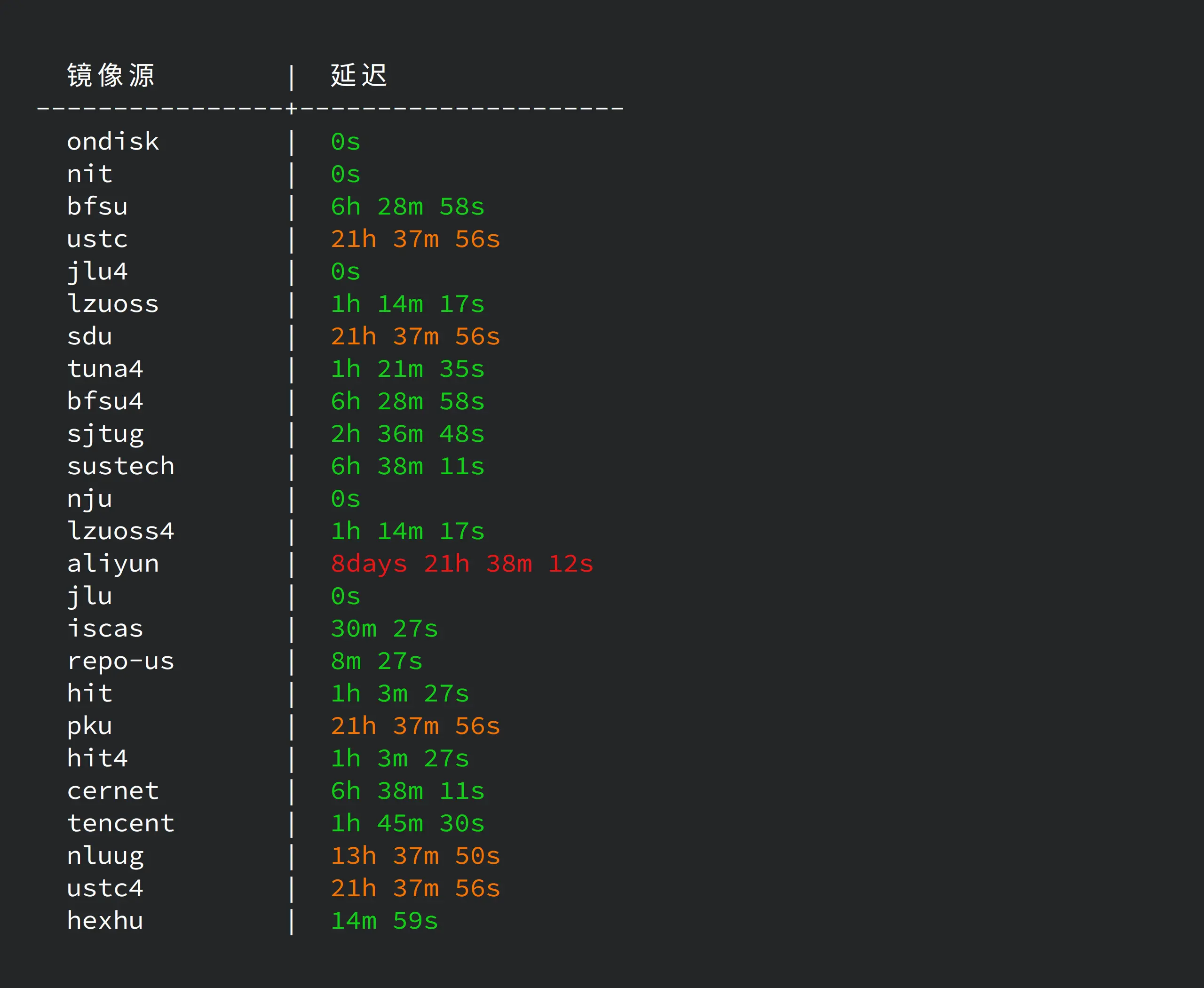 为帮助大家选用更新及时且下载速度较好的镜像,我们在 oma 1.23 引入了 oma mirror latency 命令,可一站式地测试所有镜像源相对于社区官方源的延迟: